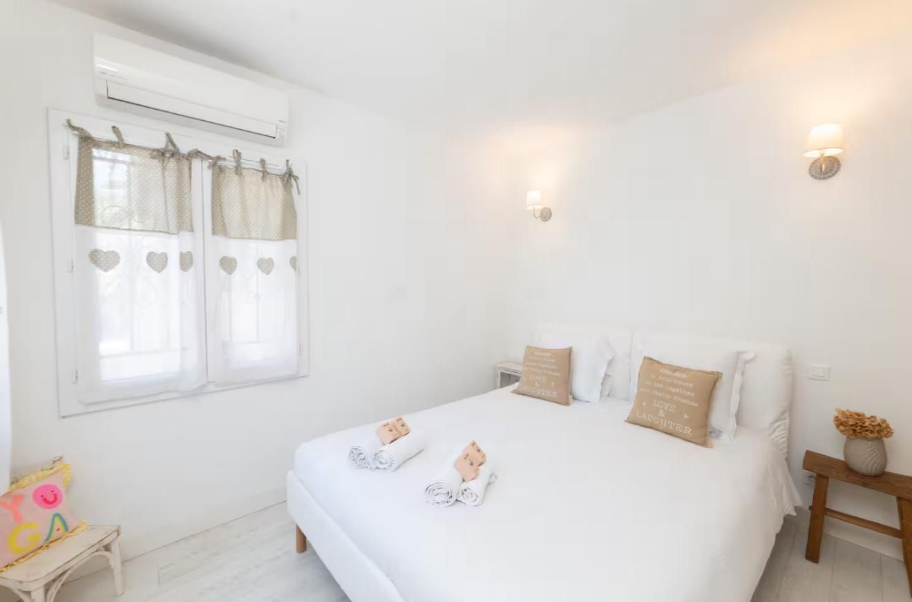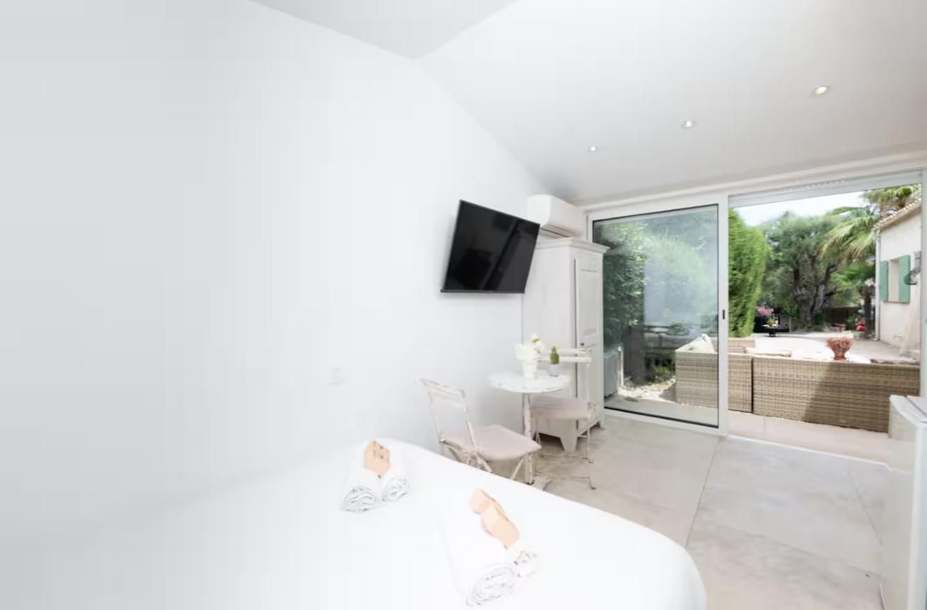 SUITE PARENTALE (avec sa salle de douche attenante) :- 1 lit king size 180x200 cm² avec draps fournis- 2 tables de chevet avec lampe de chevet- Penderie de rangement- Baignoire balnéo d’angle- Douche à l’italienne- Meuble double vasque avec miroir- WC dans la salle de bain- Sèche serviettes- Sèche-cheveux→ CHAMBRE 2 :- 1 lit queen size 160x200 cm² avec draps fournis- 2 tables de chevet - Penderie de rangement→ CHAMBRE 3 :- 1 lit queen size 160x200 cm² avec draps fournis- 2 tables de chevet- Penderie de rangement→ CHAMBRE 4 :- 1 lit queen size 160x200 cm² avec draps fournis- 2 tables de chevet- Penderie de rangement→ STUDIO - CHAMBRE 5 (avec sa salle de douche attenante) :- 1 lit queen size 160x200 cm² avec draps fournis- TV LED Full HD avec chaînes nationales- 1 table de chevet avec lampe de chevet- 1 table à manger avec chaise pour 2 personnes- Colonne de rangement- Réfrigérateur + micro-ondes- Douche à l’italienne- Meuble simple vasque avec miroir- WC dans la salle de douche- Sèche serviettes- Sèche-cheveux→ SALLE DE BAIN :- Douche à l’italienne avec ciel de pluie- Meuble simple vasque avec miroir- Sèche serviettes- Sèche-cheveux