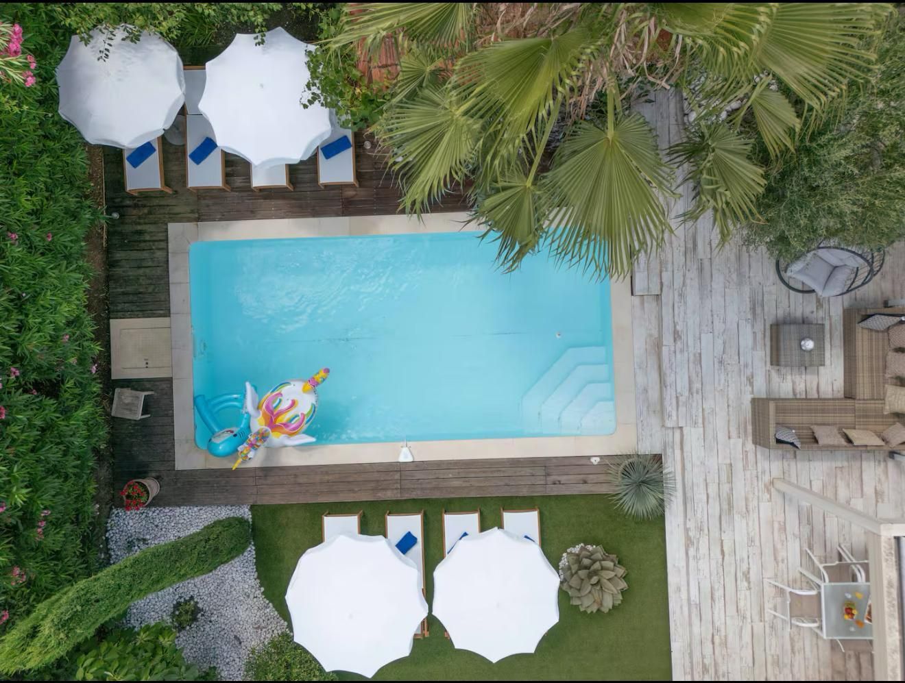 → ESPACE EXTÉRIEUR :- Piscine privative extérieure de 4,00m x 8,00m extérieure, transats et parasols- Terrasse privative de 50 m² devant la piscine avec cuisine d’extérieur salle à manger sous pergola, barbecue weber, salon de jardin- Jardin paysager de 400 m²